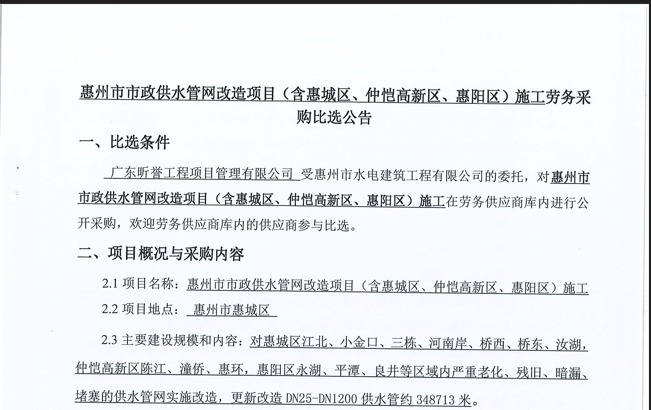 廣東省惠州市中心城區地下管網系統提升工程-內街小巷排水管網病害修復及錯混接改造項目一期施工勞務采購(第二次)中選候選人公示……